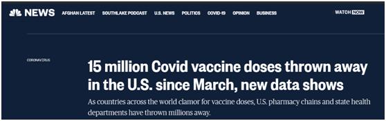 NBC报道截图:新的数据显示,美国自3月以来已丢弃1500万剂新冠疫苗